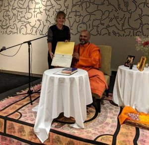 Le entregué al Swami Nityananda el diploma por la Declaración de Interés Social de la Ciudad de la actividad que realizó en la Ciudad, la que incluyó tanto una conferencia con enseñanzas hindúes así como una maravillosa sesión de meditación guiada. El reconocimiento que promoví en la Legislatura Porteña tuvo como objetivo fomentar la práctica de la meditación y el acercamiento del yoga al público así como el servicio comunitario.
